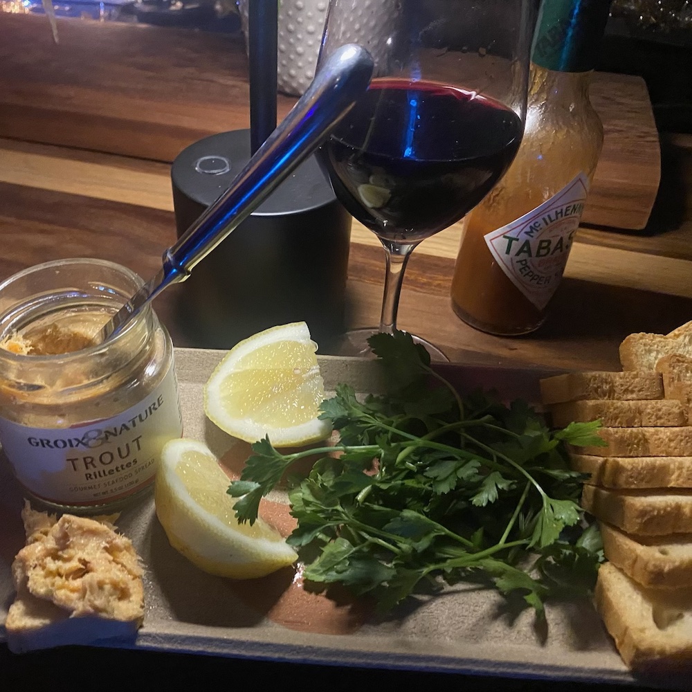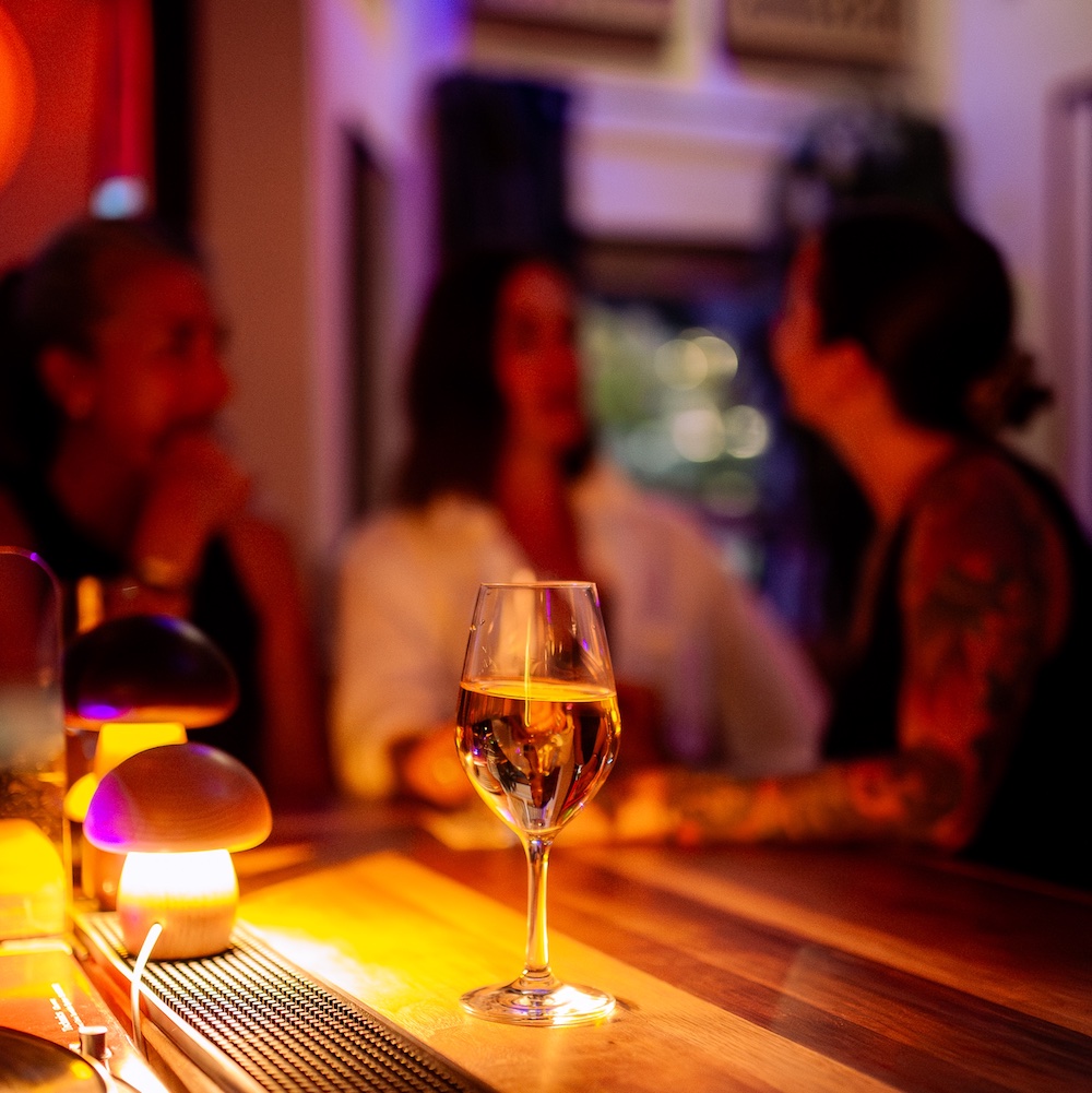 We offer local craft beer on tap, local cider, not-local sake, and around a hundred wines — including natural wine — with a light food menu of tinned fish, stuffed grape leaves, and a few salty snacks. Bottles of wine are also available to go, at retail pricing.